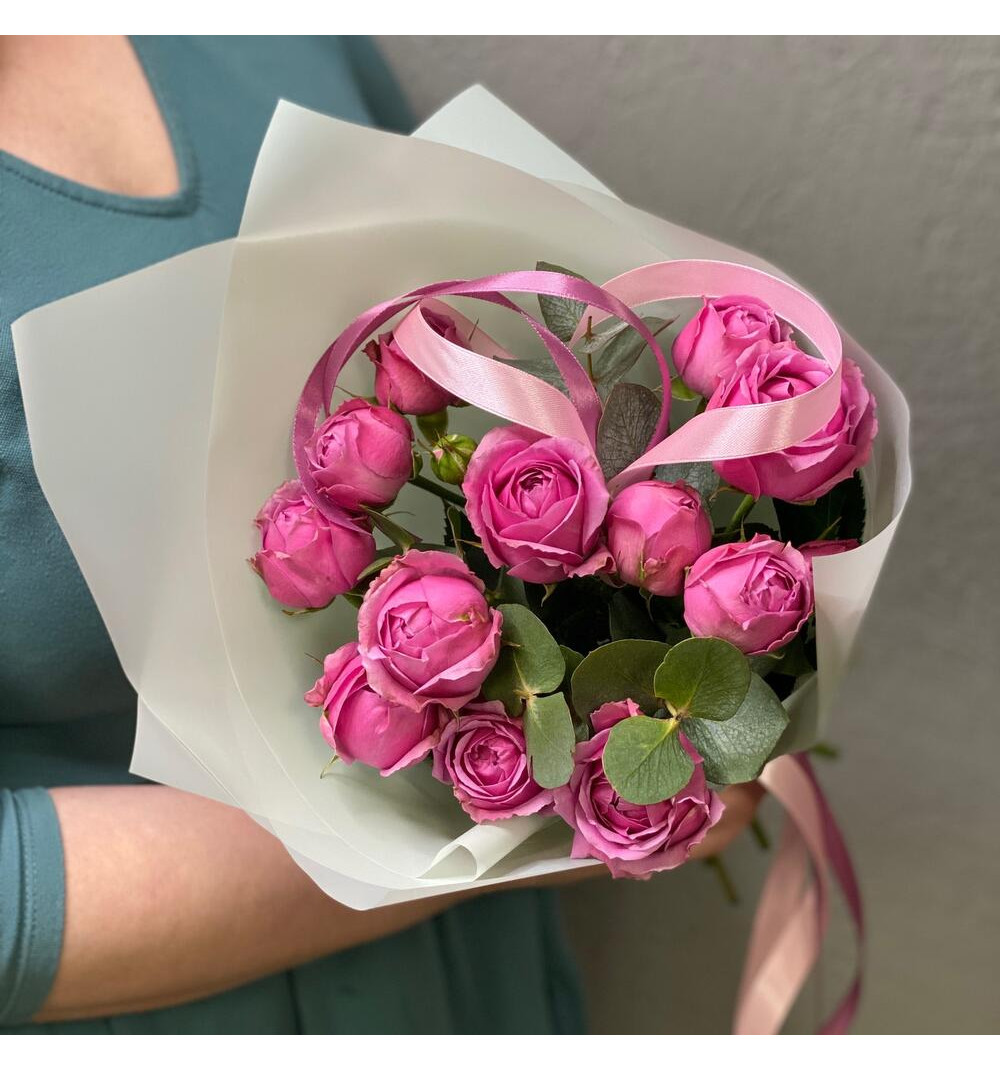 Авторский букет из пионовидных роз и ароматного эвкалипта